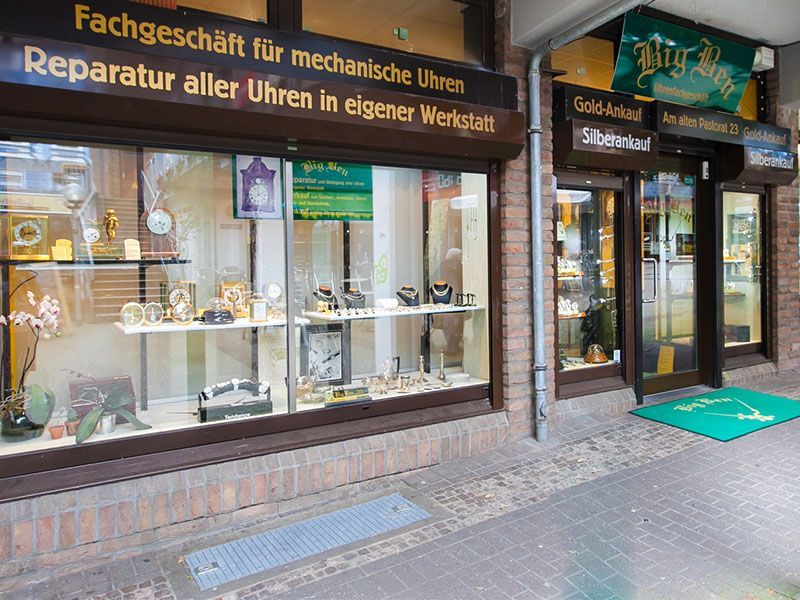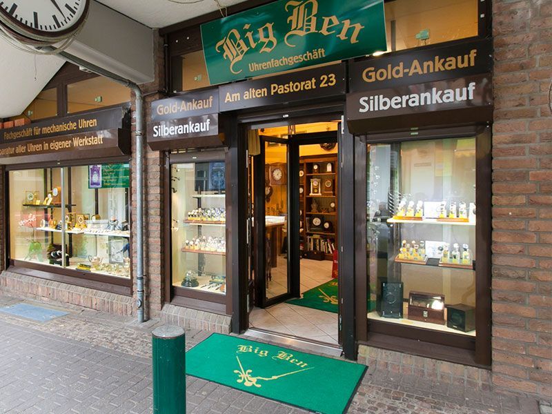 Im Jahr 2001 wurde unser Uhren-Fachgeschäft Big Ben in Bergisch Gladbach gegründet. Seit über 15 Jahren finden Kunden in unserem Geschäft in der Grünen Ladenstraße antike Uhren und hochwertige Armbanduhren namhafter Luxusmarken. Wir beraten Kunden stets seriös, diskret und kompetent - ob bei Ankauf oder Verkauf. Des Weiteren bieten wir einen zuverlässigen Service rund um die Reparatur und Instandhaltung Ihrer Wertgegenstände an.